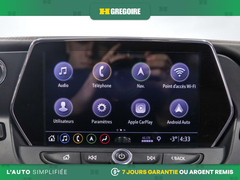 Chevrolet 4G LTE et point d'accès sans fil intégré livrable pour un maximum de 7 appareils; comprend forfait de données d'essai de 3 Go ou d'une période d'un mois (selon le premier terme atteint) à partir de la date de livraison (Consultez le site onstar.ca pour obtenir les données cartographiques et connaître les restrictions et les détails liés au système. Les services et la connectivité varient selon le modèle, les conditions ainsi que les restrictions géographiques et techniques. Requiert services connectés actifs dans le véhicule et forfait de données. Les forfaits de données sont offerts par AT&T ou son fournisseur local. L'alimentation des accessoires doit être active pour utiliser le point d'accès sans fil.)