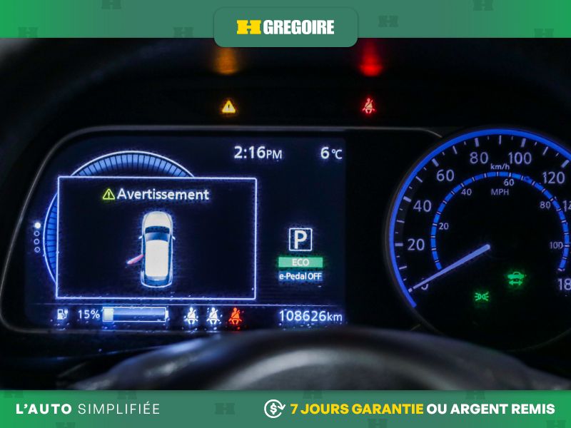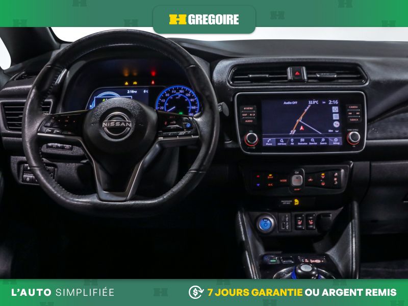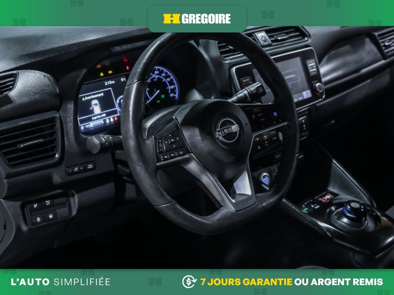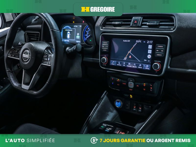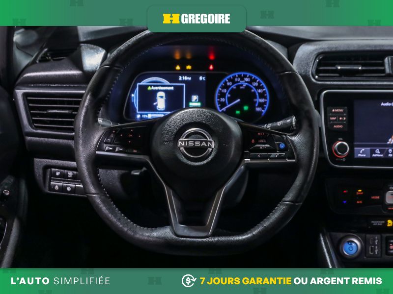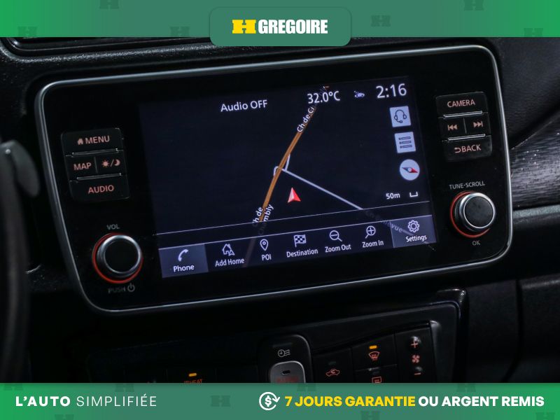 • Services NissanConnect EV alimentés par SiriusXM -comprend : témoin d'état de charge de la batterie, lancement de la séquence de charge, mise en marche du système CVCA, alerte automatique en cas d'impact, appels d'urgence, repérage du véhicule en cas de vol, téléservices incluant verrouillage et déverrouillage des portes, fonction d'activation du klaxon et d'allumage des feux à distance, alertes personnalisables dont l'alerte de zone limite, de service de voiturier, de couvre-feu et de limite de vitesse