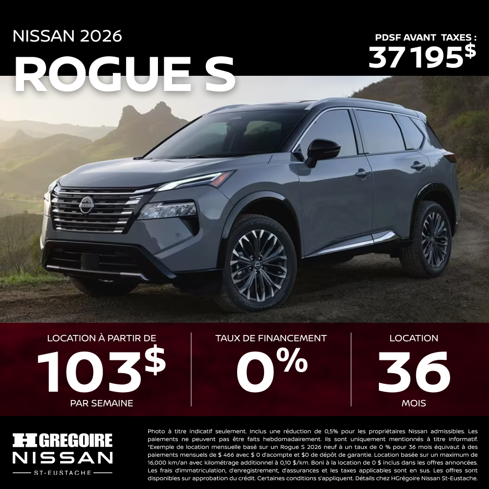[*] Offres en vigueur du 1 avril, 2026 au 30 avril, 2026. Les paiements ne peuvent pas être faits hebdomadairement. Ils sont uniquement mentionnés à titre informatif. * Exemple de location mensuelle basé sur un Rogue S 2026 neuf à un taux de 0 % [OU, à un taux d’intérêt annuel de 0.4 % sans réduction de 0.5 % pour les propriétaires Nissan admissibles]. Une location de 36 mois équivaut à des mensualités de 448 $ [OU, 458 $] avec un acompte de 0 $ et un dépôt de garantie de 0 $. Location basée sur un maximum de 16,000 km/an avec kilométrage additionnel à 0,10 $/km. Obligation totale de location de 16 216 $ [OU, 16 576 $]. Boni à la location de 0 $ inclus dans les offres annoncées.Les frais d’immatriculation, d’enregistrement, d’assurances et les taxes applicables sont en sus. Les offres sont disponibles sur approbation du crédit par l’intermédiaire de Nissan Canada Finance pour une durée limitée, peuvent être modifiées sans préavis. Les détaillants sont libres de fixer des prix individuels. Les véhicules et les accessoires sont fournis à titre d’illustration seulement.